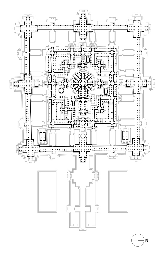 L'estructura és concèntrica. Quadrats que contenen altres quadrats en simetries perfectes. Els murs tenen els desgast del temps i l'erosió de l'aigua. Quan els francesos (1880) van redescobrir aquestes temples la vegetació s'ho havia menjat tot, per això va poder salvar-se el que ara veiem, malgrat la guerra i la destrucció del segle XX.