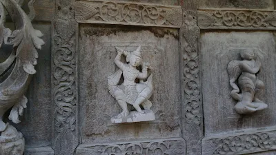 Nuestro diligente guía, nos explicó que las 12h los monjes, sacan a la serpiente de donde está la estatura de Buda para meterla en una pequeña piscina, para lavarla. El templo es de una iconografía extraña, con dragones y serpientes. De los dragones, o “los chinthe como los simha aparecen en las monedas de Birmania y Sri Lanka. Siempre se encuentran a pares, y se encargan de proteger las pagodas o templos donde están apostados. En Birmania puede hallarse una variación, el manussiha, que tiene cabeza humana y cuerpo de león, por lo que es comparable a la esfinge occidental, y se encuentran en cada una de las cuatro esquinas de los templos. Se dice que puede saltar sobre sus enemigos desde nueve direcciones distintas.” (https://es.wikipedia.org/wiki/Chinthe)